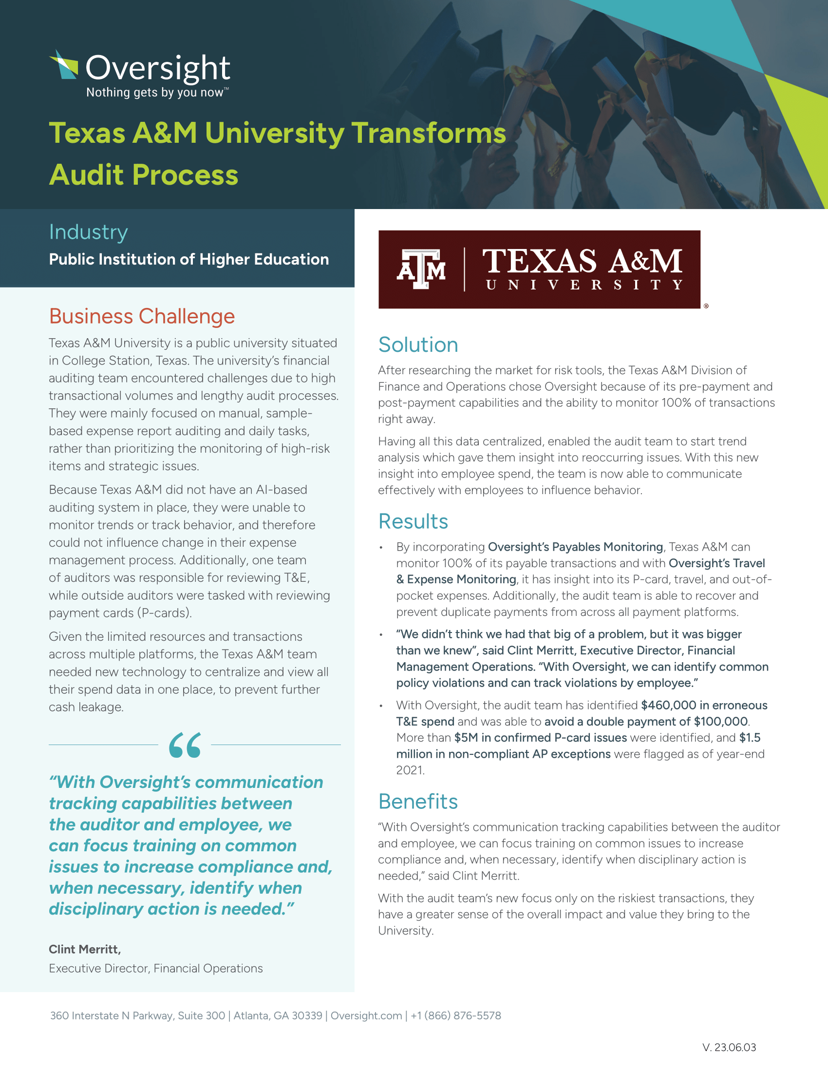 After researching the market for risk tools, the Texas A&M Division of Finance and Operations chose Oversight because of its pre-payment and post-payment capabilities and the ability to monitor 100% of transactions right away.